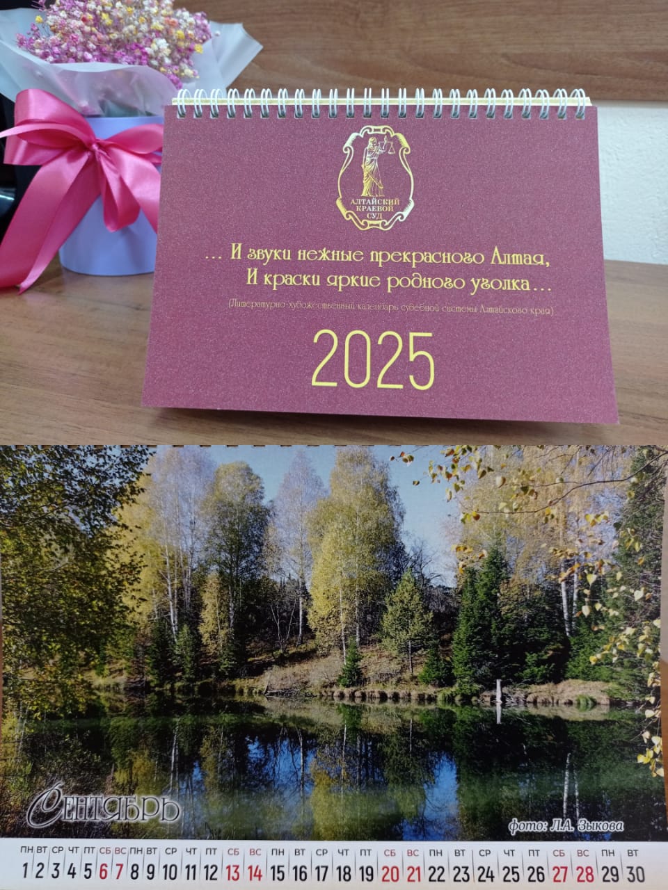 Судьи и работники аппарата Шипуновского районного суда приняли участие в творческом проекте Алтайского краевого суда по подготовке литературно-художественного календаря на 2025 год, направили 67 фотографий красивейших мест Алтая. В литературно-художественный календарь судебной системы Алтайского края на 2025 год вошла фотография помощника председателя суда Шипуновского районного суда Зыковой ЛА.